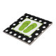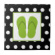 Um azulejo que caracteriza uma ilustração de um par de chinelos verdes dentro de um quadrado esboçado no verde sobre um fundo preto com bolinhas brancas.