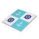 O azulejo azul e branco do tabuleiro de damas tem uma âncora branca do barco e a roda de um capitão azul.