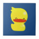 Um pato de borracha amarelo alegre e sorridente contra um azulejo de cerâmica azul.