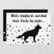 Esta placa Holiday engraçada e exclusiva apresenta um esquema simples de cores preto-e-branco e uma fonte fofa moderna. Na frente lê-se: "Enquanto os pastores observavam seus rebanhos à noite", que é um verso de uma popular carol de Natal, no topo e no fundo há uma simples silhueta do cachorro german shepherd na neve caindo! Que fofo! A parte de trás do cartão apresenta Cartões de natal na mesma fonte cartoonesa e o nome da família e o ano na tipografia minimalista. Abaixo está nevando de novo! As saudações podem ser facilmente personalizadas para um toque pessoal. Este design único, moderno e contemporâneo certamente fará você se destacar nesta temporada de festas!