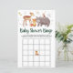 Jogo de bingo de chá de fraldas de inverno doce, com ilustrações aguçosas em aquarela de animais de floresta, flores, estrelas de verde e ouro e flocos de neve e "Bingo Chá de fraldas" em um roteiro verde de floresta.