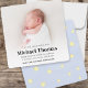 Anuncie sua chegada ao estilo com este adorável modelo de anúncio do bebê! Apresentando um design moderno e minimalista, este cartão destaca um layout fotográfico de cheio sangrado e fundo listrado azul-macio com delicadas estrelas de piscadelas, amarelas e azuis. A disposição proporciona espaço para as estatísticas de natalidade dos bebês numa fonte moderna e fácil de ler, criando um eterno, mas estética nova. Perfeito para mostrar as primeiras fotos do seu bebê, este simples cartão, mas elegante, é uma bela maneira de compartilhar sua alegria com a família e os amigos. Personalizável para um toque pessoal exclusivo!