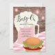 Convite único para um chá de fraldas baby-q com uma caneca de cerveja cor-de-rosa colocada numa toalha de mesa com um hambúrguer colocado sobre fundo de madeira.