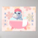 Está na hora do banho e aqui está um bebê hippo adorável sentado numa banheira rosa e vestindo um turbante rosa, tomando um banho de bolha para te fazer companhia! Há um bonito papel de parede de flores no fundo.