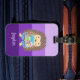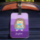 Uma etiqueta de bagagem roxa para crianças (ou crescidas) que adoram ler. Adicione o nome da criança. Procure o cobrir de passaporte correspondente.