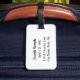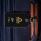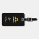 Etiqueta de bagagem elegante com símbolo de libra dourada sobre fundo preto.