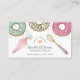 Um cartão de visita para um padeiro, pasteleiro, catador de sobremesas em pinks, verdes com uma espiral de estrelas de ouro, rosquinhas com aspersores e um saco de canalizações e uísque, assado com frase de amor com um pequeno coração cor-de-rosa.