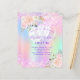 Uma menina e feminina Doce 16, 16º convite de aniversário. Na frente: Um arco-íris, fundo holográfico colorido em roxo, rosa, verde-menta, ouro-rosa. Decorado com brilho pinto-claro, faíscas e balões brancos. Personalize e adicione um nome e detalhes da parte. O nome é escrito com um script de estilo manuscrito, letras cor roxa.
