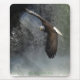 Um majestoso americano Bald Eagle gosta do spray das cachoeiras enquanto voa para a floresta próxima.
