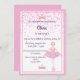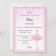 Ballerina e convites de aniversário princesa em branco e rosa para meninas. À frente de um fundo branco, quadro cor-de-rosa, uma bailarina em tutu cor-de-rosa, vestido, tiara, rosa e roxo confetti como decoração. Letras roxas. Modelos para nome e informações de sua parte. Traseira: cor rosa pastel.