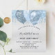 Para um aniversário elegante de 21 ruas (ou qualquer idade). Um fundo metálico falso prateado. Decorado com pingos de brilho azul claro, aparência de pingar tinta e balões azuis. Personalize e adicione um nome, 21 anos e detalhes da festa. O nome é escrito com um script de estilo manuscrito.