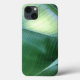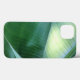 O trabalho de arte de abstrato original neste caso do iPhone 13, em tons naturais de verde, é uma fotografia original em close feita por ZoeSPEAK das folhas de uma bananeira. O sol da manhã ilumina a parte de baixo verde-clara de uma folha de banana, e destaca as costelas na face verde-escura de outra, enquanto ela se curva para as sombras.