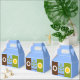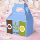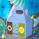 Caixa com bandeira de Fresno, Califórnia; bandeira com três bandas verticais de castanho, azul e verde, com ilustrações estilizadas de berço, planta e sol