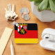 Chaveiro com pavilhão da Renânia-Palatinado; design com tricolor horizontal a preto, vermelho e amarelo (ouro), com casaco de braços do Estado no canto superior esquerdo