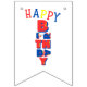Esta bandeira exibe as palavras "Feliz Aniversário" em uma fonte impressa única, estilo e colocação com letras vermelhas, azuis e amarelas, além de um chapéu de aniversário com serpentinas neste tema e estilo de aniversário. Todas as bandeiras têm impressão de um lado, são seguras para uso ao ar livre, feitas de poliestireno plástico resistente e corda de plástico grossa, tendo (16) bandeirolas de cauda de andorinha de 5,5" x 8" em uma corda de 1,8 metros de comprimento.