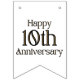 Esta bandeira apresenta as palavras "Feliz 10º Aniversário" em uma fonte de impressão única com letras douradas e contorno preto. Todas as bandeiras têm impressão de um lado, são seguras para uso ao ar livre, feitas de plástico poliestireno resistente e corda de plástico grossa, e têm (16) bandeirolas de cauda de andorinha de 5,5" x 8" em uma corda de 1,8m de comprimento.