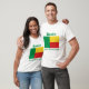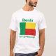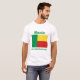 Um título e um slogan editáveis acompanham a banda vertical verde à esquerda das bandas horizontais amarelas e vermelhas da bandeira beninesa na parte dianteira deste t-shirt. A parte traseira indica um mapa detalhado de Benin.