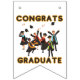 Este design de banner bunting apresenta as palavras "Congrats Graduate" com fonte de impressão Studly mais letras coloridas de cinza com contorno amarelo, mostrando estudantes celebrando após uma formatura neste tema de educação. Todos os banners têm impressão de um lado, seguros para uso ao ar livre, feitos com poliestireno plástico resistente e corda de plástico grossa, tendo (16) bandeiras de cauda de andorinha de 5,5" x 8" em uma corda de 6 pés de comprimento.