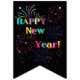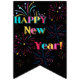 Esta bandeira apresenta as palavras "Feliz Ano Novo" em uma fonte de impressão única/negrito com letras de cores diferentes, além de serpentinas de fogos de artifício e confetes neste tema e estilo de Ano Novo. Todas as bandeiras têm impressão unilateral segura para uso ao ar livre, feitas de plástico poliestireno resistente e corda de plástico grossa, com (16) bandeiras de cauda de andorinha de 5,5" x 8" em uma corda de 6' de comprimento.