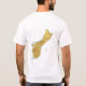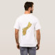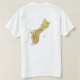 Um título e um slogan editáveis acompanham o motivo central em um fundo azul com beira vermelha da bandeira guamesa na parte dianteira deste t-shirt. A parte traseira indica um mapa detalhado de Guam.