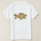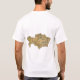 Um título e um slogan editáveis acompanham os motivos amarelos em um fundo azul da bandeira de Kazakhstani na parte dianteira deste t-shirt. A parte traseira indica um mapa detalhado de Kazakhstan.