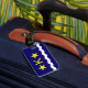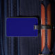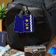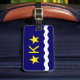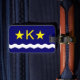 Etiqueta de bagagem com design com pavilhão de Kinshasa, capital da República Democrática do Congo, bandeira azul com onda branca, duas estrelas ouros e letra "K" no centro