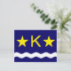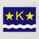 Cartão postal com desenho da bandeira de Quinxassa, capital da República Democrática do Congo, bandeira azul com onda branca, duas estrelas douradas e letra 'K' no centro