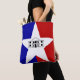 Tote Bag com a bandeira de San Antonio, Texas. Uma bandeira azul e vermelha com estrela branca e uma ilustração de Álamo no meio