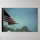 Uma fotografia da bandeira americana acenando na brisa, sobre montanhas.