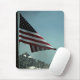 Uma fotografia da bandeira americana acenando na brisa, sobre montanhas.