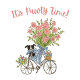 Essas bandeiras de bunting apresentam um retrato de aquarela de um filhote bonito sentado em uma bicicleta com um grande buquê de flores cor-de-rosa e arcos azuis e brancos.