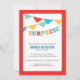 Guirlandas coloridas e uma faixa ousada acentuam este convite de festa surpresa.