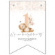 Organizar um primeiro aniversário, esses doces mal conseguem acreditar que o bunting de aniversário será a adição perfeita para o seu planejamento. Com a frase 'MAL CONSEGUIMOS ACRREDITAR!', uma ilustração de um urso em aquarela segurando grama de pampas e flores delicadas em pêssego.