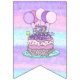Bolo de aniversário desenhado, cor-de-rosa e roxo, banner de banner de banner de balões.