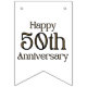 Este banner de bunting apresenta as palavras "Feliz 50º Aniversário" em uma fonte impressão única com contorno preto de letras douradas. Todos os banners têm impressão frente e verso em solteiro, segura, feita com poliestireno plástico resistente e a corda plástica espessa tem (16) bandeiras de 5,5" x 8" em uma corda longa de 6'.
