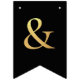 Uma faixa de bandeiras para um casamento com cores negras e douradas, com as palavras "Sr. & Sra." e o nome da família do novo casal e 3 corações. O texto encontra-se em bonés pretos sobre fundo de folha de ouro falso, os corações e as ampersas são folhas de ouro falso sobre fundo preto. Apropriado para 7 letras como Johnson (o padrão) ou Jackson.