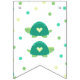 Bandeiras bonitas de chá de fraldas que dizem "Dobre a Alegria" em diferentes tons de verde com tartarugas gêmeas, bolinhas e listras.