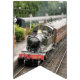 Um trem a vapor bem restaurado e carruagems de uma era passada chegando à estação de trem.