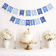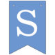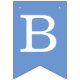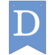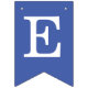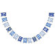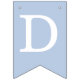 Uma faixa de bandeirolas para bapstismos, primeiras comunhões ou confirmações religiosas. As bandeirolas têm nuances alternadas de azul, de azul mais escuro para mais claro. As letras são brancas, Há 2 cruzes amarelas douradas entre as palavras. A mensagem é "Deus Abençoe" seguida de um nome de 6 letras que você deve alterar letra por letra (o padrão é Daniel).