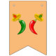 Este belo bunting apresenta um par de chilis, um chili vermelho e um chili verde. Ambos têm olhos pretos e bocas cor-de-rosa. Cada Chili está vestindo um chapéu sombrio que tem um crânio de cor oposta ao dos chili em comemoração ao Dia Mexicano do Festival dos Mortos, Dia De Los Muertos. O sombrero também contém três flores com pétalas vermelhas e verdes alternadas representando a bandeira do México.