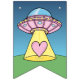 Feliz Aniversário, Terra! Hospedar uma festa fora deste mundo, com alienígenas com esses bonitinhos Ingleses Felizes Bandeiras de Aniversário. O design apresenta uma ilustração digital de um OVNI rosa e roxo que está enrolando um coração rosa. Está pairando num céu azul escuro sobre uma colina verde-pastosa. Esta design de espaçonave é perfeita para uma festa celebrando o amante espacial em sua vida.