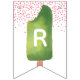 Projetado para combinar nossos convites de festas de aniversários de picolé de cor d'água, este lindo design de bandeiras de verão apresenta dezesseis campos de texto personalizados para soletrar sua mensagem (mostrada com "Parabéns"), com letras brancas em picolés cor-de-rosa e verde. Uma borda de confete rosa no topo de cada sinalizador completa o design.