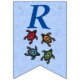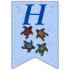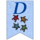 Esta bandeira em forma de bunting Happy Birthday é azul claro com letras azuis escuras com um grupo de quatro tartarugas abstrato festivas com conchas coloridas. Personalize o ano de aniversário com os modelos.