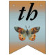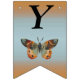 Esta bandeira moldada com o banner Feliz de aniversário é azul-claro no centro com laranja queimado no topo e no fundo. Uma borboleta monarca bonito em blues, laranjas e castanhos está na bandeira. Personalize o texto de aniversário feliz e o ano de aniversário com os modelos.