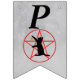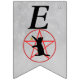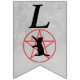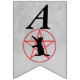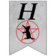 Esta bandeira em forma de bunting Happy Halloween é uma cinza leve com a silhueta de um gato preto alcançando uma estrela dourada em um pentagrama vermelho em círculo. Personalize o texto do Feliz Dia das Bruxas com os modelos.