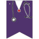Decoração única para festa de médico com aventais hospitalares roxos criativos e listras.