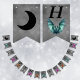 This flag shaped bunting Happy Halloween banner has to black crescent moons and colourfuly flying bats in grey, pink, greenish blue, and orange. Customise the Happy Halloween text with the templates.