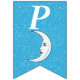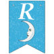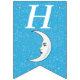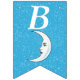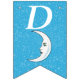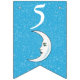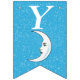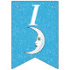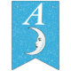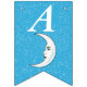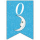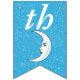 Esta bandeira em forma de bunting Happy Birthday é azul-aqua brilhante com uma dispersão de pequenas estrelas brancas e uma lua crescente branca que tem um rosto. Personalize o ano de aniversário com os modelos.