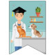 Comemorar um estudante de veterinária na graduação com a ajuda desse design de texto parabéns, juntamente com a ilustração fofa original de Destei de uma mulher veterinária numa sala de exames de uma clínica veterinária. O veterinário está vestindo um boné de formatura preto com um punho amarelo, um casaco branco de laboratório, esfregões azuis e um estetoscópio em volta do pescoço. O veterinário tem cabelo castanho e expressão facial sorridente. Na parede, há duas prateleiras flutuantes castanhas com uma planta de folha verde e dois pequenos frascos de remédios colocados nelas. Na frente do veterinário, há um gato laranja e um filhote de cor castanha e branca sentado numa mesa de exame de cinza.