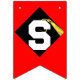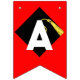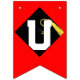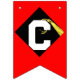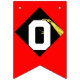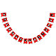 Banner de parabéns pela festa de formatura com boné de formatura preto e ouro sobre fundo vermelho.